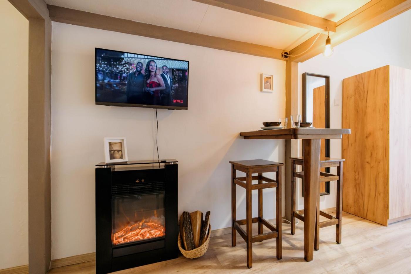 One-Bedroom Apartment. This apartment features a fireplace. Boasting a private entrance, this apartment features 1 living room, 1 separate bedroom and 1 bathroom with a shower and a hairdryer. Guests can make meals in the kitchen that has a stovetop, a refrigerator, kitchenware and a microwave. The apartment features a flat-screen TV with streaming services, a tea and coffee maker, a seating area, a wardrobe as well as city views. The unit has 2 beds.